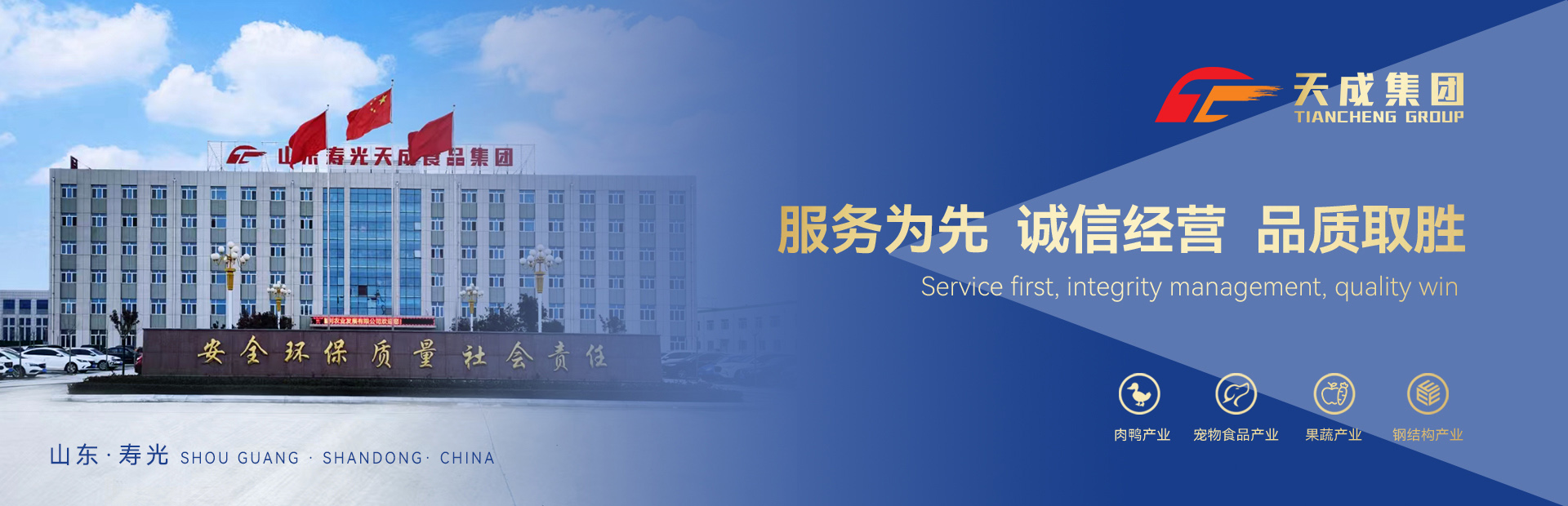 山東壽光天成食品集團有限公司創建于1980年,是一家以櫻桃谷肉鴨和寵物食品加工產業為主,集飼料加工、獸藥生產、種鴨飼養、雛鴨孵化、商品鴨標準化養殖、肉鴨宰殺加工、寵物食品加工、果蔬種植加工、面米食品加工、鋼結構工程和房地產開發于一體、產業化配套成龍的現代多元化農牧企業集團。